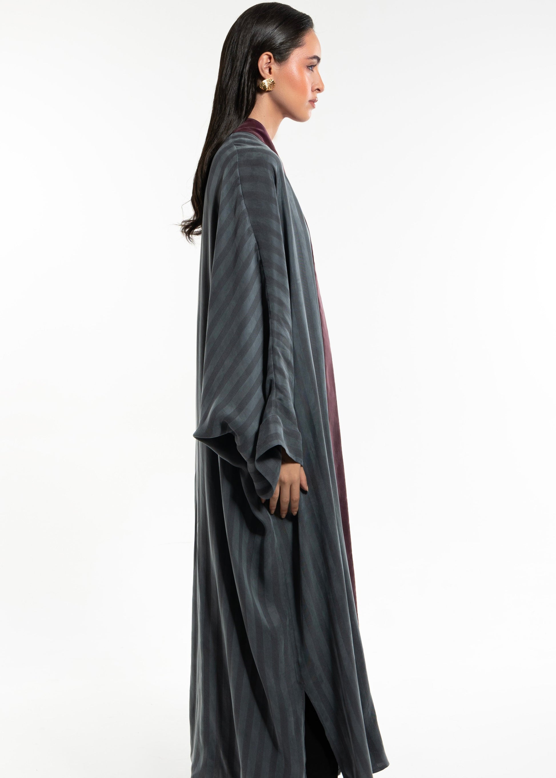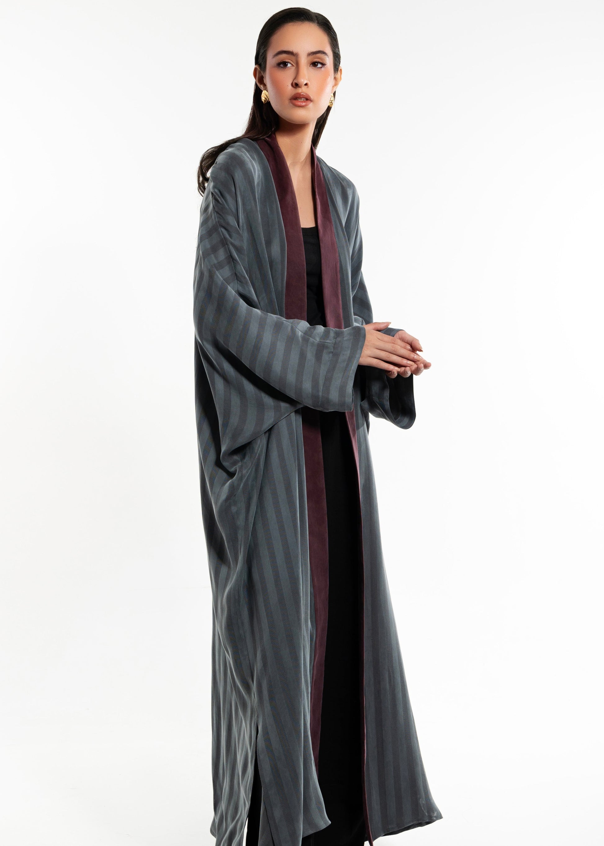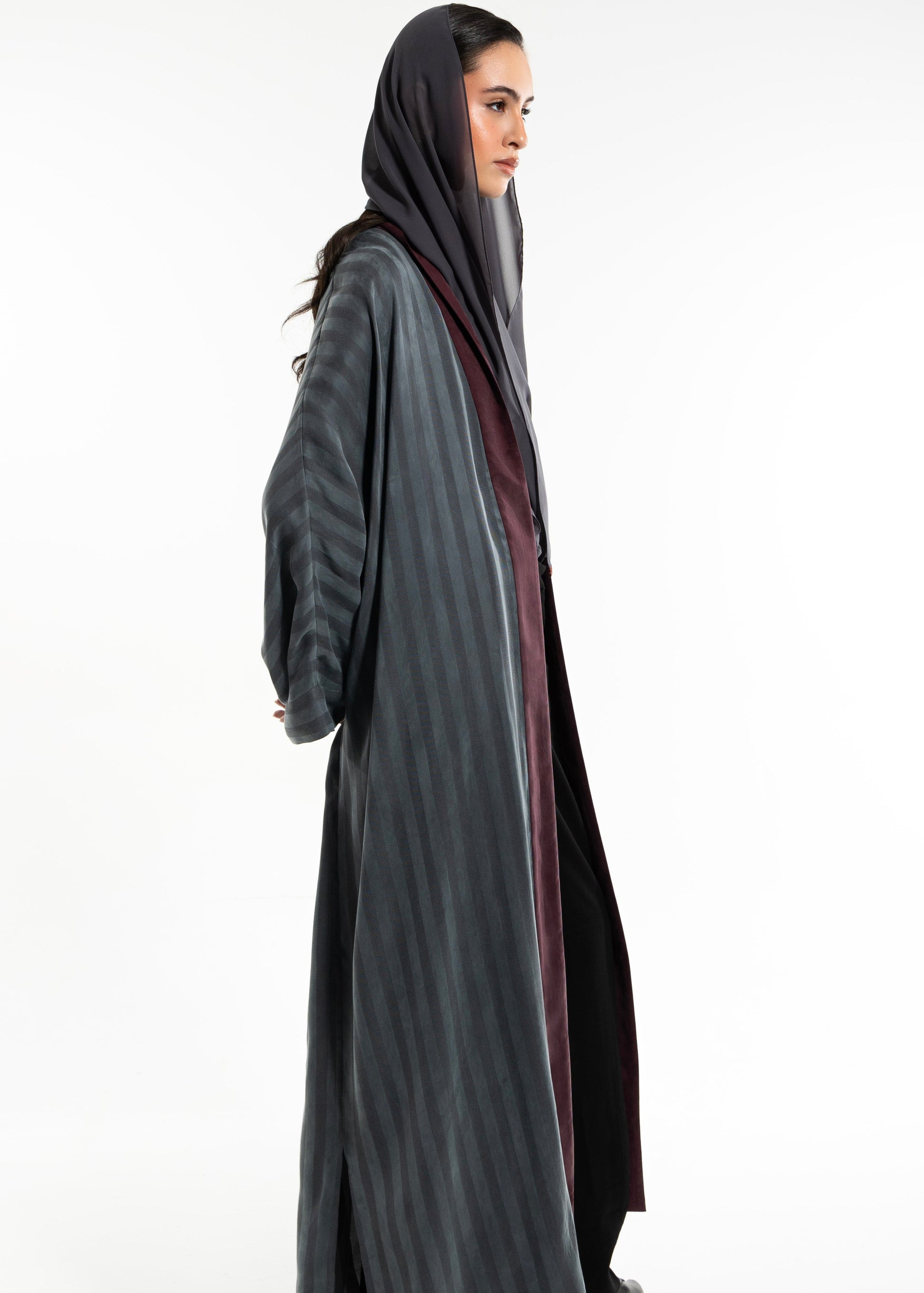 A lightweight, summer-friendly abaya crafted from silk cupra stripes, featuring a striking mix of deep burgundy accents beautifully paired with a classic grey base. Designed for effortless elegance and comfort, this piece elevates any occasion with its refined look.