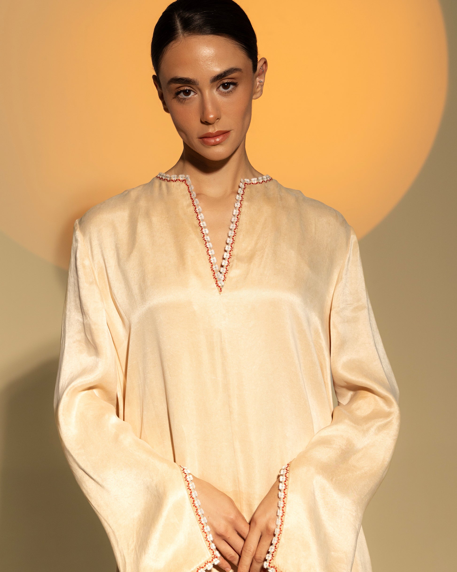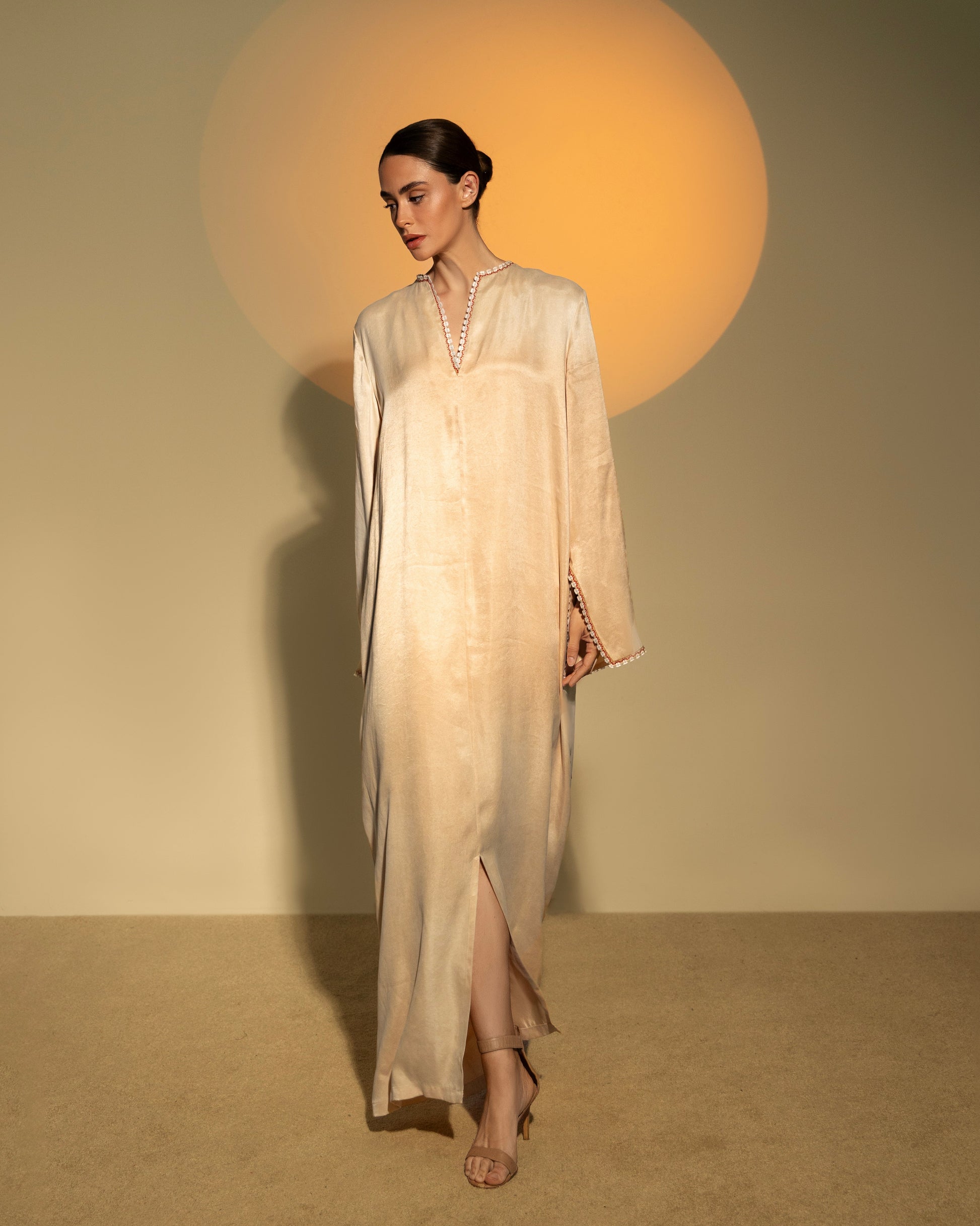 A one-tone caftan with a modern asymmetric design. Designed for a relaxed and effortless fit, featuring a subtle daisy trim for a soft, charming touch.