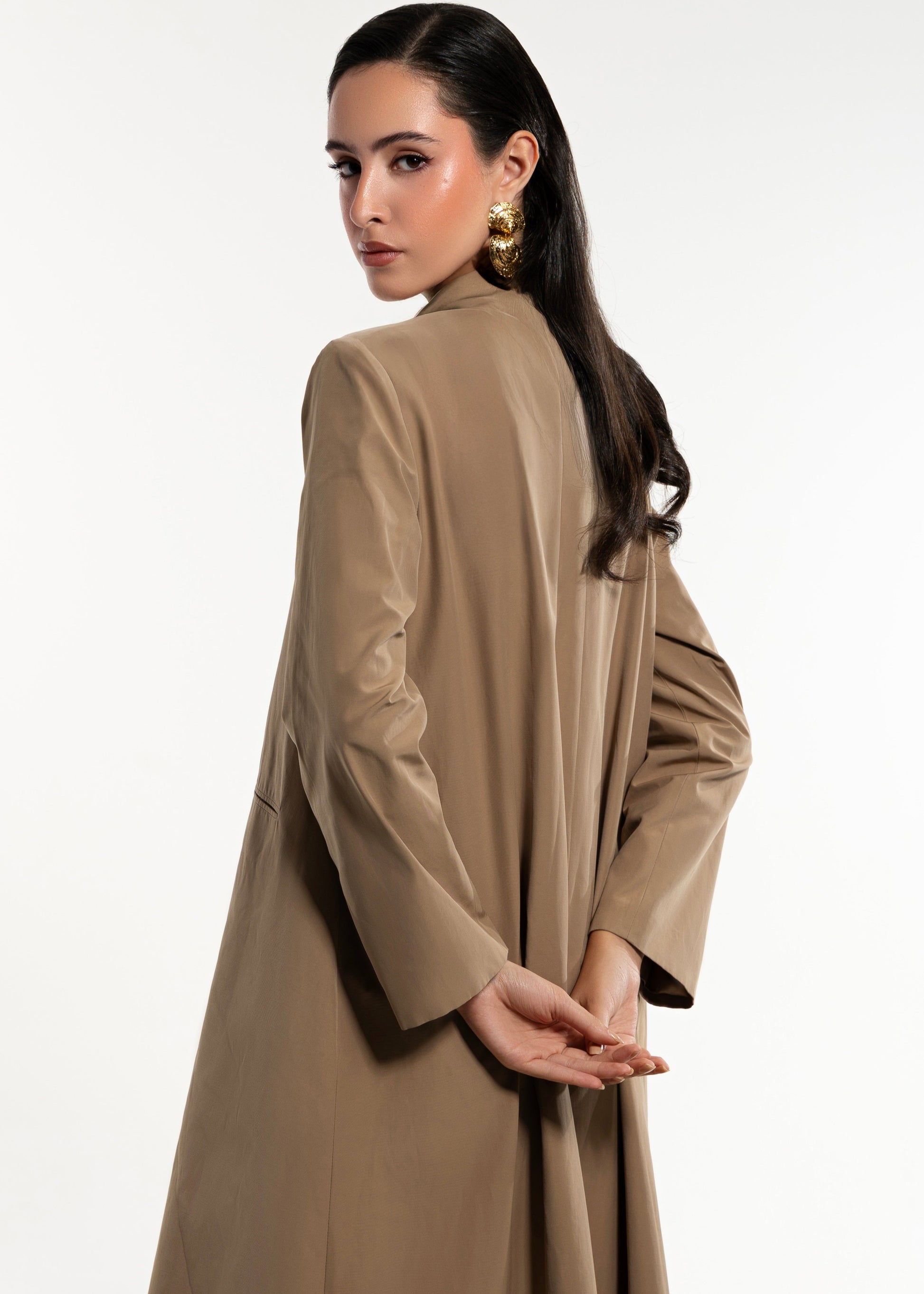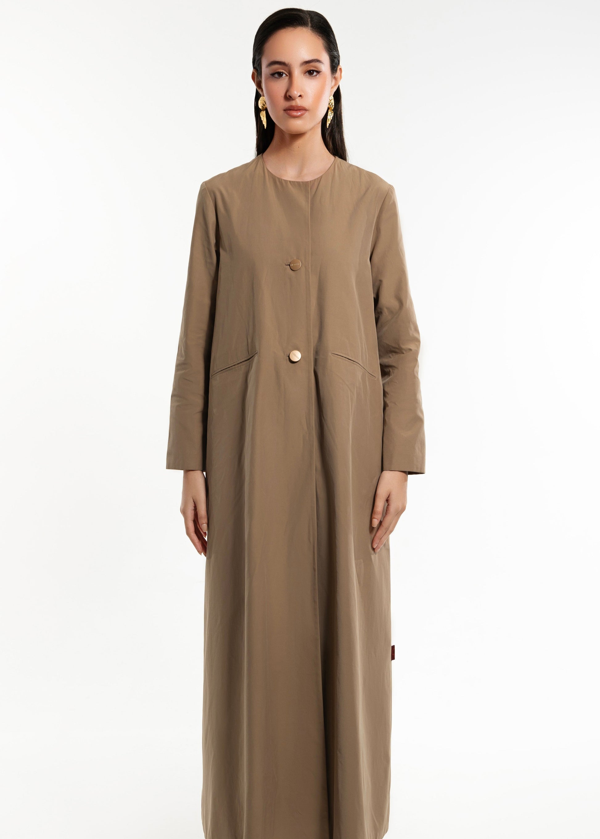 A sleek, minimalist abaya tailored for a slim fit, blending official elegance with travel-ready comfort. Designed with side pockets and finished with custom Misbaha-branded buttons, this classic beige piece effortlessly elevates casual style while keeping it practical and modest.
